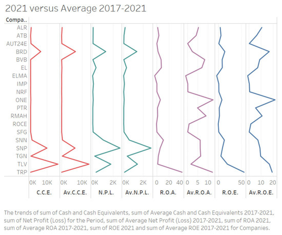The first category of indicators collected for the analyzed companies concerned the size indicators, the calculation of their average values, and the clustering of companies according to their size. Thus, the average values recorded by the indicators, the average number of employees, the value of net turnover, the value of total assets, and the value of equity led to the selection of the selected companies in the following size classes: E—very small, D—small, C—medium, B—large, and A—very large. The comparative analysis (Figure 1) of the average values of the financial performance indicators for the 5 years with the value of the indicators for 2021 revealed the fact that their trend was maintained, which entitled us to continue the exploratory approach by considering the average values to determine the general score assigned for the financial performance.