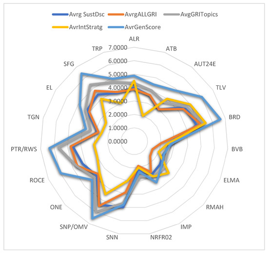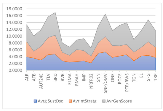 The aim pursued in this section was to determine and compare the average disclosure scores of sustainability information for all GRI aspects included by companies in their sustainability reports drawn up for the year 2021, the average disclosure score on ESG components, and topics from the GRI 201–418 standards [14], as well as the average disclosure score obtained for the integrated business model, and the communicated sustainability strategy. The total average disclosure score obtained for disclosing all sustainability aspects covered by GRI was 3.5460, lower than the average score recorded for disclosing ESG information on GRI topics 201–418 [14] (4.1403), but higher than the average disclosure score recorded for reporting and disclosure of the information on the integrated business model, as well as sustainability strategy (3.3157). The best average disclosure score for reporting all sustainability aspects covered by the GRI was recorded by SNP. The average sustainability information disclosure score that also included the score given for the GRI index used, as well as the compliance statement, was 3.7368, with the best score also recorded by the SNP company. Considering all peer-reviewed sustainability information from the sustainability reports of the sampled companies for the year 2021, we calculated an overall average disclosure score for which the obtained value was 4.6517, indicating a medium to good reporting and disclosure performance (Table 3).
