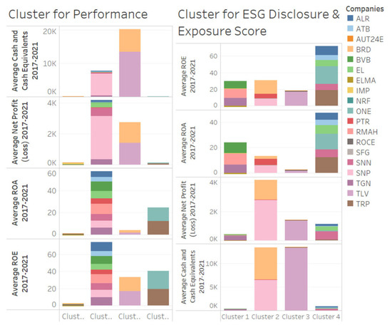 To observe whether there was any connection between the financial performance of the companies and the exposure to ESG risks, as well as the disclosure degree of ESG information, a comparative analysis of the clustering results according to the criteria of financial performance, as well as ESG risks, was performed (Figure 5).