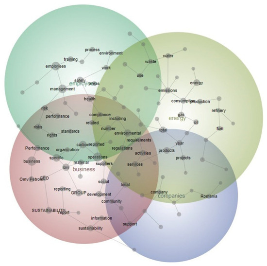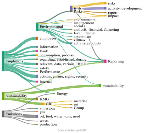 The links between the components can be observed and examined by the height of the rectangular calves. From exploring the links between the text components of the 56 sustainability reports analyzed, the dominant ESG topics were employees, management, business, company, safety, products, activities, energy, risk, environment, and operations. Thus, we can conclude that all 17 companies for which the text content of the sustainability reports published online in English was examined disclose ESG information with a higher frequency on the topics mentioned above. The most salient topic was related to the social component of ESG, namely, employees.
