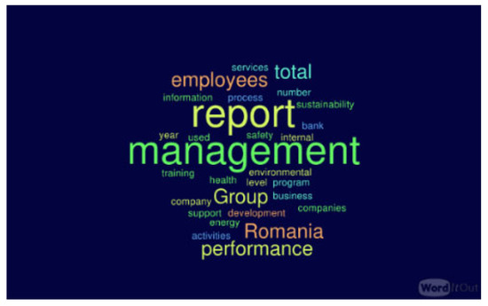 From the analysis of the main concepts extracted with the help of Leximancer from the sustainability reports of the first six companies ranked by the value of the overall average ESG disclosure score, 198 concepts resulted, which were examined by frequency. The highest recorded frequency was eight words. Selecting a frequency of five words, 29 concepts were found (Figure 7). Among the 29, the dominant concepts were report, management, performance, group, employees, Romania, and total.