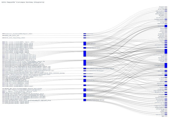 The second stage of the research consisted of the qualitative investigation of 56 sustainability reports published by the sampled companies for all the years for which they were made public, in English, from the perspective of textual content analysis to identify dominant ESG themes and concepts. Leximancer v5.0 software was used for this purpose, and Sankey diagrams were designed to visualize and interpret significant links between items. Content analysis of the reports for the top six ranked companies by overall ESG disclosure performance score revealed four dominant themes and seven concepts with the highest frequency. It can be concluded that the dominant topic, and that which had the highest connectivity score, was employees. Then, a content analysis of all sustainability reports for 17 companies was carried out, where the results led to six dominant themes, and among the dominant concepts, the one with the highest frequency and the highest degree of connectivity was also employees. Consequently, the most prominent topic in the content of the analyzed sustainability reports was employees, with significant direct links to the concepts of actions, ensure, rights, security, data, relevance, consumption, process, performance, and indirect to the concept of reporting. This result is relevant from the perspective of the highlighted dominant themes and concepts and the correlations between the different themes, for instance, employees–emissions through energy.