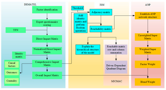 The decision experimental and evaluation laboratory (DEMATEL) technique is a comprehensive approach that integrates graph theory and matrix theory to effectively study and make informed judgments about complicated system elements [53]. This method thoroughly identifies and analyzes factors within complicated networks [54]. The DEMATEL method is highly effective for identifying causal relationships between assessment parameters and revealing structural patterns [55,56]. This method considers the interdependence between variables and clusters of alternative solutions in large systems with many failure modes [57]. Individual variations and expert subjectivity strongly influence the conclusions of the DEMATEL method since it relies on expert knowledge to determine the scoring, which may lead to biases and misinterpretations of relationships. Therefore, the integration of fuzzy theory with the DEMATEL approach is considered essential to address the challenges associated with inaccuracies and biases arising from expert assessment data [58]. The interpretive structural model (ISM), a well-known network analysis tool based on graph theory, processes and analyzes complex system structures using logical matrix operations. In recent years, ISM has become an effective tool for system analysis. Based on expert experience and knowledge mining, it can decompose disordered elements in complex systems into multilevel hierarchical structural models [59,60]. In order to properly evaluate the main components, influence the degree of the indicator system, and build the hierarchical relationship of the indicator system, the DEMATEL and ISM methods need to be combined [61]. Meanwhile, the combination of the two can reduce the computational complexity and the complexity of the accessible matrices in the ISM. The MICMAC approach focuses on analyzing the magnitude of the driving and dependent forces of each factor in the system, with the primary objective of identifying the key factors that significantly influence the system, and is the final step in conducting an ISM analysis [62,63]. The use of the DEMATEL and ISM approaches allows for a more comprehensive representation of the causal relationships between different components within the system, including their order, direction, and hierarchy. However, the determination of weights remains an intractable task. Therefore, incorporating the analytic network process (ANP) to determine priority weights for systems with dependency and feedback relationships also overcomes the shortcomings of the ANP. In addition, because all starting element weights in the ANP calculation results are 0, to avoid this phenomenon, the total influence matrix is combined with the weight vector of the ANP method to obtain a mixed weight. Therefore, the integration of the DEMATEL-ISM-ANP method in this article can effectively and systematically describe the interrelationships between the restrictive factors for promoting photovoltaic green roof renovation in existing buildings, establish a hierarchical structure model for photovoltaic green roof renovation in existing buildings, and determine the weights of each factor. The flowchart is shown in Figure 1.
