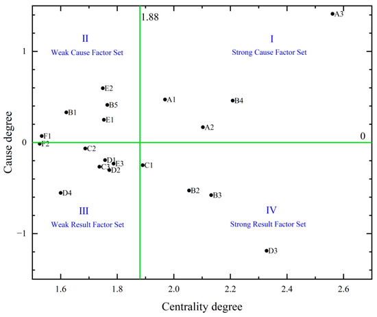 The central degree reflects the position of the i-th factor in the indicator system and its importance in the failure process. The causal degree reflects the causal relationship of the influencing factor. The difference between the degree of influence and the degree of influence of an element k() is called the cause degree of the element; if it is positive, it means that element k has a great influence on the other elements, which is called the cause factor; by contrast, if it is negative, it means that element k has a great influence on the other elements, which is called the result factor [66,67]. Centrality represents causation, and the formula is as follows: