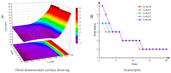 The purpose of setting the threshold value λ is to remove the influence relationship between indicators with less influence and simplify the system structure. Its size directly affects the composition of the adjacency matrix and further affects the division of the reachability matrix and system structure. The sum of the elements in the adjacency matrix’s row and column is considered the node degree, and the node degree is ranked in descending order to obtain the attenuation three-dimensional surface plot and scatter plot of each factor under different threshold values of λ (Figure 3). The principle of determining the value of λ is that the node is moderate, and the distribution diagram of the node degree of the two adjacent threshold values tends to be stable for the first time. The 3D surface plot in Figure 3A shows that the surface first stabilizes at two different threshold values. The approximate value range of the threshold is determined to be 0.10–0.14. By plotting the scatter plot under different values, it can be seen that the two lines coincide at λ = 0.11 and λ = 0.12 and stabilize first. Therefore, the threshold is set to λ = 0.12.