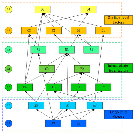 where is considered the initial level when Equation (14) is established; is then subtracted from K, and the second level is calculated using Equations (12) and (14), etc., until the final level is calculated. The above-mentioned factor set may be used to create the ISM of affecting factors.