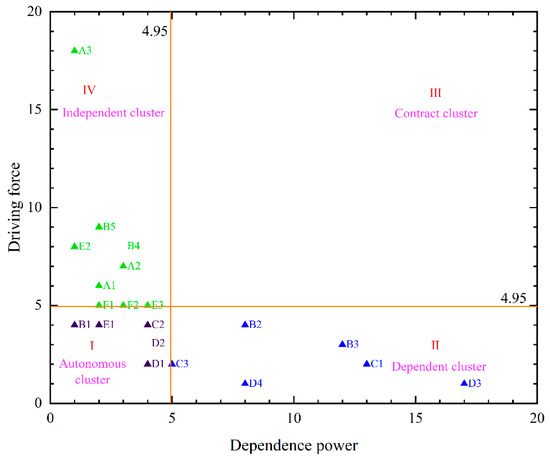 Each factor’s driving force and dependency value were calculated using Equations (15) and (16) in Step 11, as shown in Table 8. Each factor’s driving force and dependency value were used as coordinates, and the MICMAC analysis quadrant diagram was drawn; then, the average driving force and dependency value were used to determine the dividing line, which divided the diagram into four quadrants, as shown in Figure 5. The first, second, third, and fourth quadrants are autonomous clusters, dependent clusters, associated clusters, and independent clusters, respectively. The greater the dependency is, the more this component depends on other factors to be resolved, and the stronger the driving force is, the more this element can contribute to the resolution of other factors. Spontaneous factors include B1, C2, D1, D2, and E1. These factors have low driving power and dependency, but they play a connecting role and are the focus of promotion. Dependent factors include B2, B3, C1, C3, D3, and D4. The driving force of these factors is low, and the degree of dependence is high. Many other elements usually influence them. They are the direct factors associated with promotion obstacles and are vulnerable to other factors. The third quadrant has no influencing factor, indicating that the result is stable. The independent elements include nine items, namely, A1, A2, A3, B4, B5, E2, E3, F1 and F2. These factors, which are the core cause of promotion barriers and have a stronger influence on other factors but are less influenced by other factors, have a high driving force and low reliability. This component can be considered individually in the promotion of photovoltaic green roofs.