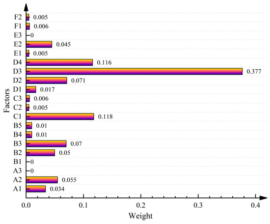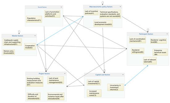 In Step 6, Equations (6) and (7) were used to calculate the impact, influence, centrality, and cause values of barriers to promoting photovoltaic green roof renovation in existing buildings, as shown in Table 5. In the causal degree dimension, the larger the value, the easier it is for that factor to influence other factors. Factors with a degree greater than 0 are causal factors, while those with less than 0 are outcome factors. According to Table 5, 9 causal factors and 11 outcome factors constrain the promotion of photovoltaic green roof renovation in existing buildings. The top five factors in the causal ranking are A3, E2, A1, B4, and B5, indicating that these five factors have the most significant impact on other factors and result in a greater difficulty of change. The five factors with the highest absolute values are D3, B3, D4, B2, and D2, indicating that these factors are most susceptible to other factors. The causal factor is usually an indirect factor affecting the promotion, while the outcome factor is a direct one.
