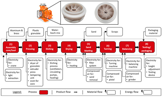 The examined product is an impeller that conveys the fluid within a chemical pump. The impeller is manufactured in eight process steps. Figure 2 shows the impeller, the eight process steps and the respective input and output resources.