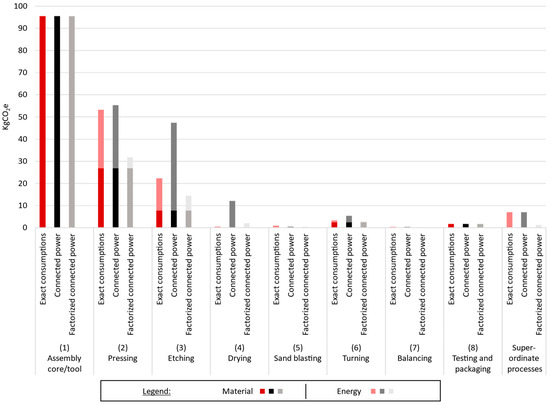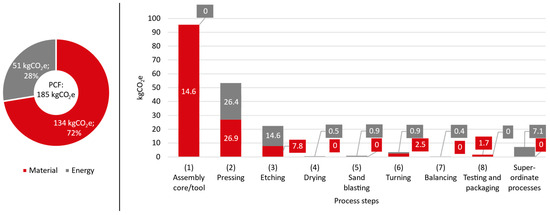 The uncertainty factor related to the use of secondary data shows a much higher deviation for the PCF: +22%, if only the connected power and the process time is used, and −19% if that is factorized as described before. Firstly, it must be noted that this uncertainty factor influenced only the emissions due to energy flows—the emissions for material flows were calculated in the same way as for the baseline scenario. Therefore, it is assumed that production systems containing more energy intensive processes could result in even higher deviations in the final PCF result. Furthermore, the factor used in the second calculation scenario was determined for machine tools. In the production steps of the impeller, mostly other machines like a press or an oven are used; hence, it is unsurprising that the factor is inaccurate.