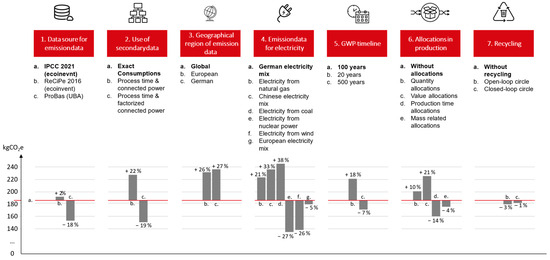 A further question to be investigated is which source for (secondary) data is obtained. Here, all three standards are vague and only give examples of where secondary data could come from. These include life cycle databases, the published literature, and national life cycle inventories, e.g., for standard emission factors [11] (pp. 28–29), [13] (p. 53), [14] (p. 19). This is often a source of uncertainty, especially for emission factors used to convert specific resources into CO2 equivalent emissions, as there are sometimes considerable differences between various sources [27]. For this reason, the influence is also investigated quantitatively in the case study.
