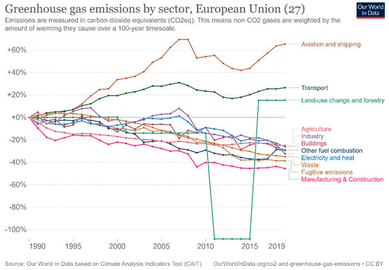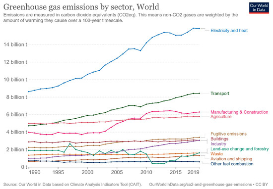 - Ritchie, H.; Rosado, P.; Roser, M. Emissions by Sector. 2020. Available online: https://ourworldindata.org/emissions-by-sector (accessed on 19 July 2023).