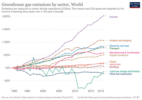According to data based on the Climate Analysis Indicators Tool (CAIT) [13], as of 2019, the three main sources of GHG emissions are electricity and heating, transport, and the manufacturing and construction sectors. Transportation accounts for about 16% of total greenhouse gas emissions and around 2% of total emissions come from aviation [14]. From 1990 to 2019, GHG emissions from aviation and shipping increased by more than 100% relative to other sectors [14]. Figure 1 shows the change in each industry’s GHG emissions from 1990 to 2019.