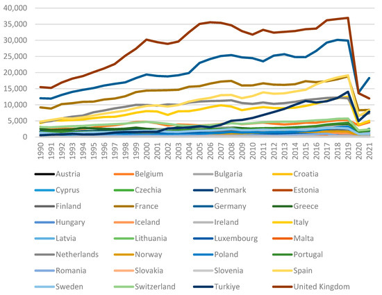In the current study, the sample is comprised of the countries in the European region in order to emphasize the regional effects of several factors as well as to see whether the EU ETS coverage makes a difference in triggering or slowing down GHG emissions. In this study, two variables that have not been previously utilized are used as explanatory factors. These are business tourism spending (BTS) and capital investment in travel and tourism (CAPITAL). Focusing on the 1990–2021 period, a considerably long time span allows for the analysis of pre- and post-ETS effects on aviation emissions, as CO2 emissions from aviation have been included in the EU ETS since 2012. By including Switzerland and Türkiye in the sample, which are not members of the EU and not covered by the EU ETS, and the United Kingdom (UK), which is no more an EU member but whose emissions are covered by the UK ETS as of 1 January 2021, heterogeneity in the region is accounted for in terms of climate policy.