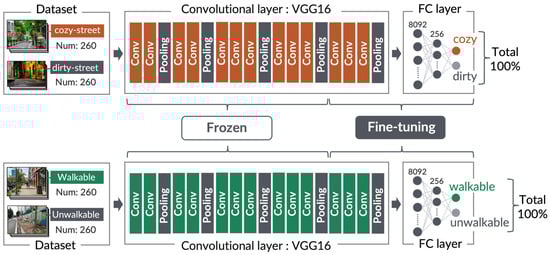 Fine-tuning involves relearning the weights of convolutional layers near the output layer by replacing the fully connected layer, which serves as the final output layer in the existing model. VGG16 [68] is a 16-layer model comprising 13 convolutional layers and three fully connected layers, known for robust feature representations across diverse image sets. The fully connected layers were reconfigured to classify streets into two categories based on walkability and lingerability indices. We fixed the weights of the first ten layers from the input side for the feature extractor, retraining only the three convolutional layers on the output side. By inputting the street images to be evaluated, the output provides the similarity to the trained street images as a probability (Figure 1). The probabilities output by the model were used as the WI (walkability index) and LI (lingerability index) of the streets, serving as indicators to evaluate spatial performance.