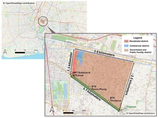 The study area is the Sukhumvit area, situated in the Vadhana district of Bangkok, which is marked by severe traffic congestion (Figure 2). The Sukhumvit area, situated in the heart of Bangkok, is a typical location that is currently experiencing traffic issues such as congestion and accidents. As a central hub, it represents a prime example where problems arising from urbanization and motorization are already manifest. These challenges are expected to intensify with further urban and motorization expansion in the future. Consequently, this study focused on the Sukhumvit area, a single superblock where various transportation issues are already prevalent, conducting research to address these challenges proactively. The study area is encompassed by roads of varying lengths, measuring 1.3, 2.5, 3, and 3.1 km.