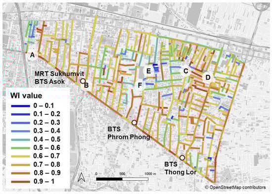 The WI of the streets in the target area was visualized on a map (Figure 3). The WI values were relatively high in thanon, which surrounds the area and forms a superblock, while low values were observed in the sois in the center of the area. To delve into this discrepancy, we examined images of areas with high WI values in the thanon (A, B), areas with high values at sois (C, D), and areas with low values at sois (E, F). Figure 4 shows the street images and their corresponding WI values, with the locations marked as A to F in Figure 3.
