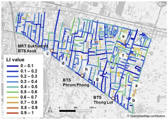 Conversely, the high LI areas in sois e and f were selected from the northeastern part of the area, characterized by a high concentration of streets with relatively high LI. These areas are situated at the end of sois from Sukhumvit Road. The high LI is thought to be influenced by the absence of passing traffic in this residential area, minimal traffic, limited on-street parking, and the presence of trees, providing a sense of unity with nature.