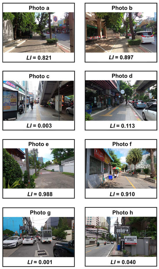 The LI of the streets in the target area was visualized (Figure 5), and in comparison to the WI, the LI values were generally smaller. To further examine this result, we scrutinized images of high (a, b) and low (c, d) LI values in thanon and high (e, f) and low (g, h) LI values in sois. Figure 6 shows images of the street space and LI values, with the locations marked as a to h in Figure 5.