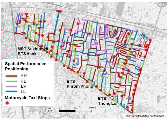 The streets’ spatial performance was evaluated by comprehensively assessing walkability and lingerability. The WI and LI values of street links were confirmed whether the values were above (High) or below (Low) average values, and the streets were classified into four categories: HH, HL, LH, and LL. The first letter indicates the WI and the second letter indicates the LI. The streets’ spatial performance is shown in Figure 7. The spatial performance in the deeper area from thanon is various. However, as there are few motorcycle taxi stops in the area, it can be anticipated that residents living along the low spatial performance streets would tend to use private vehicles for transit stations. On the other hand, most of the streets around transit stations are classified as HL, indicating that the sidewalks around the stations are relatively well maintained. However, it does not necessarily imply that people can walk comfortably, even though stations are expected to be a center of vitalization.