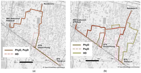 The results of PhyD, PsyD, and HD from Residences L and H to the transit are shown in the upper part of Table 2. Although Phrom Phong station is the closest station to both residences, it is the second closest in terms of HD among the three transits. The HD/PhyD ratio was calculated to be the highest at Phrom Phong station.