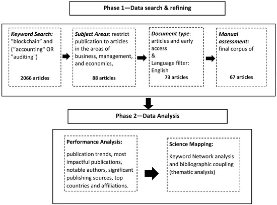 To analyze the data, we employed the Bibliometrix R-package Version 4 (Biblioshiny) application [94] for a descriptive analysis [91], as well as the VOSviewer software 1.6.20 [94] for a network visualization of keywords and bibliographic coupling [91,92]. In the bibliometrics section, we examined the summary of the main information, publication trends, most relevant authors, sources, affiliations, documents, and a country collaboration analysis. VOSviewer was used for clustering the network—“keyword analysis” and “bibliographic coupling” [94]. Based on the bibliographic coupling, this study performed a content analysis and identified themes and future research for blockchain adoption in accounting and auditing. Figure 1 delineates the search criteria (keywords, inclusion, and exclusion) and the subsequent analysis.