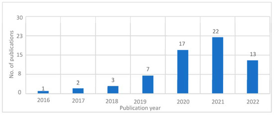 Table 1 provides an overview of the data used in the current study. The dataset comprises 67 relevant documents obtained from 32 distinct academic sources, reflecting a comprehensive collection of references. An analysis of the keywords indicates a diverse range of associated terms and concepts. Spanning the period from 2016 to 2022, the dataset encompasses the recent literature on the topic, with an average citation rate of 12.72 citations per document, indicating a significant level of involvement and acknowledgment within the academic community. The dataset involves 170 authors, with 5 single-authored and 62 multi-authored documents (collaboration index: 2.75), suggesting a proclivity toward collaborative research practices. The average number of authors per document is 2.62, with 2.82 co-authors per multi-authored document. This dataset comprehensively represents the scholarly landscape, featuring diverse literature, extensive author collaboration, and up-to-date insights.
