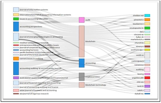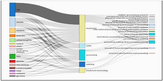 The analysis of Table 5 reveals that the USA has the highest number of publications in the field of blockchain technology in accounting and auditing, followed by Canada, Australia, Romania, Italy, and the United Kingdom. This indicates that the examination of blockchain technology in these areas is more prevalent in the USA and Anglo-Saxon countries compared to the Asia–Pacific region. It also underscores the significance of fostering research collaboration in the Asia–Pacific region to contribute to the evolving understanding and utilization of blockchain in the field. Furthermore, Figure 4 visually represents the relationships between countries, keywords, and sources in the field. It demonstrates that researchers worldwide share common keywords such as blockchain, technology, accounting, and auditing, indicating a shared focus and interest in exploring the applications and implications of blockchain in accounting and auditing.