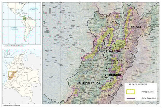 Location of the Colombian Coffee Cultural Landscape (CCLC), which includes the departments (states) of Caldas, Risaralda, Quindío, and some municipalities of northern Valle del Cauca.