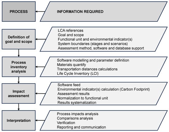 The methodology adopted for calculating the carbon footprint of the selected houses is framed in the LCA approach regulated by ISO 14040:2006 [] and ISO 14044:2006 [] standards. The methodological development of this study was carried out in four phases: (1) definition of objective and scope; (2) process inventory analysis; (3) impact assessment; and (4) interpretation (Figure 3). The LCA was carried out with the support of the software openLCA v 1.10.3 and the ecoinvent 3.6 database. The LCA was undertaken using the Intergovernmental Panel on Climate Change (IPCC) 2013 GWP 100th V1.03 impact assessment method [].