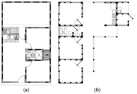 Floor plans of the houses: (a) CSB house A = 41.04 m2 (EDUR); (b) GaKB house A = 60.65 m2.