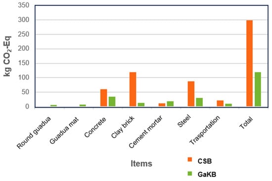 The comparative graph of kg CO2-eq by type of housing (Figure 8) shows that in both cases, the highest impacts on the environment are linked to technical materials (man-made); in the case of the CSB house, the element that generates the highest environmental load is precisely the structural brick, while in GaKB housing, the component that most affects the environment is the concrete used in the foundation and ground floor slab, due to the environmental loads from the production and transportation process of cement. By contrast, the biobased materials used in GaKB house (i.e., GaK) in the form of round Guadua and Guadua mats, which are the main components of the structural cemented bahareque system, are the ones that generate the least environmental load.