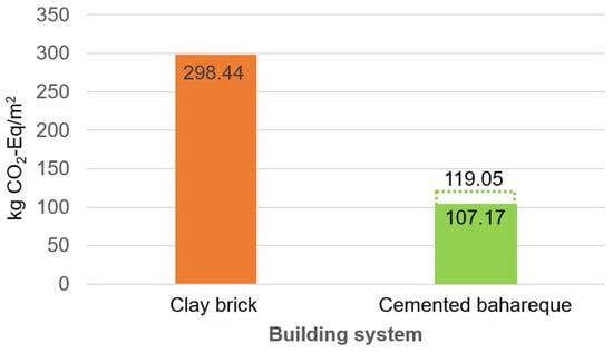 In the CSB house, the highest impact corresponds precisely to the component that gives it its name as a construction typology, the clay brick (118.7 kg CO2-eq/m2), which is almost equal to that of the total GaKB house (119.0 kg CO2-eq/m2) (Table 3). Overall, two and a half houses built using GaK would have the same footprint as one CSB house. The high impact of the CSB house is largely due to energy consumption and the generation of greenhouse gases (GHGs) during the moulding and firing processes of the bricks [,].