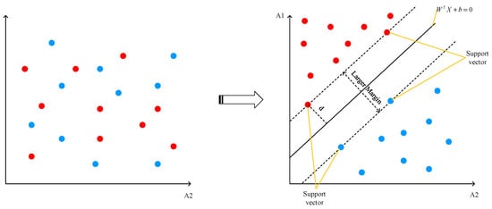SVM was first presented by Vapnik based on statistic learning theory [42], which can minimize the possibility of misclassification, and the schematic diagram of an SVM model can be found in Figure 3. The training process of an SVM is a quadratic optimization problem which is given by Refs. [46,47]: