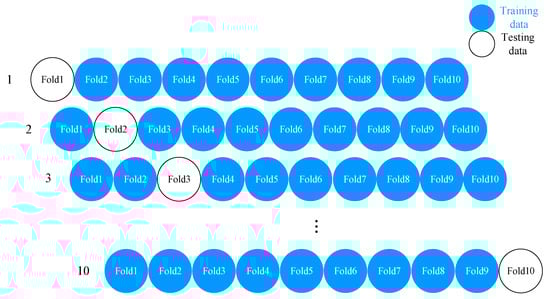 The 10-fold cross-validation is used for the data in training as it can improve the accuracy [50] and generalization ability of the model [51,52] so that the overfitting problem can be avoided. As shown in Figure 6, all data are divided into ten parts, one fold is used as validation set, and the others are used as training set in each part. Then, the optimal hyper parameters for the training model can be obtained. As the training progresses, 10% of all data are randomly selected for testing.