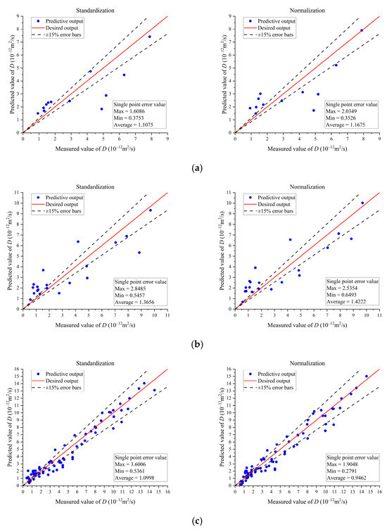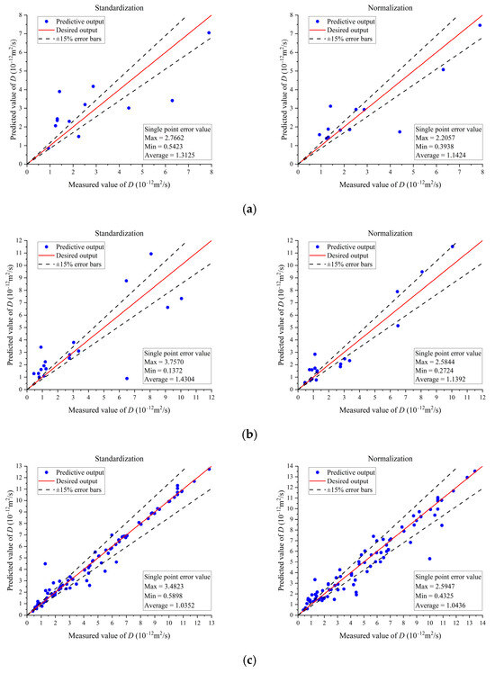 The measured values of D were taken as the horizontal coordinate, and the predicted values were taken as the vertical coordinate. The prediction results obtained by the MLP model with normalization and standardization preprocessing methods were plotted in Figure 7.