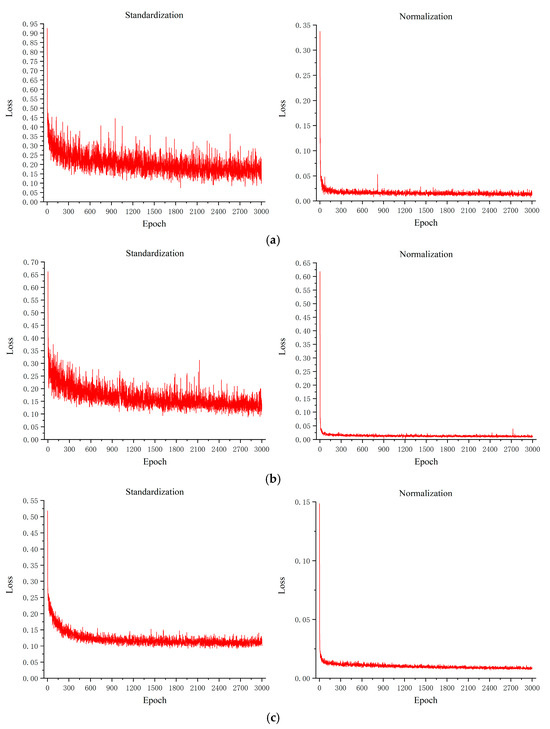 The loss function is the deviation between the real value and prediction value which can be used to evaluate the performance of the model. Figure 8 shows the relationships between the loss value and the number of iterations. It can be seen that the loss value first decreased rapidly and then leveled off in all three groups. The curves of loss function were oscillating in the first group and second group while kept stable in the third group. The oscillations appeared due to the outliers in the dataset which would affect the accuracy of the MLP model. In general, the loss value of the data trained by standardization preprocessing method was larger than that trained using the normalization preprocessing method. The oscillation quantity of the curves of the data trained using the standardization preprocessing method are greater than those trained using the normalization preprocessing method. Furthermore, the loss value of the data trained by the normalization preprocessing method oscillated significantly only at the 800th and 2700th iterations in the first two groups and remained stable in third group, i.e., it was lower than 0.007 after 3000 iterations. But the loss value of the data trained by the standardization preprocessing method was about 0.091 after 3000 iterations for the third group. This also indicates that the normalization preprocessing is more robust and more suitable for the MLP model.