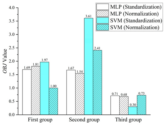 In the first and second group, the OBJ values obtained from the MLP model with standardization and normalization preprocessing method are close, while the OBJ value obtained from the SVM model with normalization preprocessing method is lower than that with the standardization preprocessing method. In the third group, both the MLP and SVM models can produce good predictions, and the SVM model with standardization preprocessing method is the most accurate one.