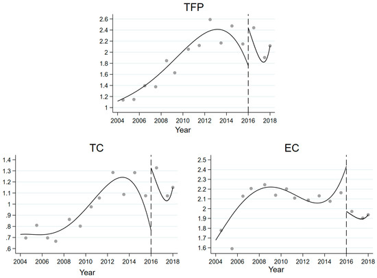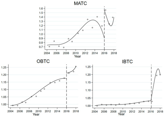 Before employing the regression discontinuity design, this article examines the relationship between the central environmental inspections and the GTFP to ensure that there are abrupt changes in the GTFP of the cities around the year of their inspections. Figure 1 and Figure 2 show the impact of the Central Ecological Environmental Protection Inspectorate on the change in efficiency (EC) and technological change (TC) of the green total factor productivity and its decomposition items (magnitude of technological change, MATC; input-biased technological change, IBTC; and output-biased technological change, OBTC) in the year of the inspection, respectively. On the left of the dotted line is the year before the implementation of the central environmental inspection, and the dotted line is the year 2016. This paper mainly analyzes the “jump” of the variables before and after the implementation of the environmental protection inspection policy, and the trend in the following years.