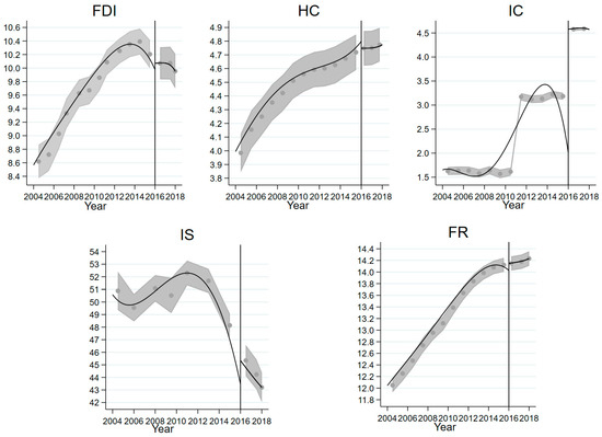 If the GTFP’s main control variables also show a significant “jump” in the central environmental inspection policy year of 2016, the GTFP jump cannot then be attributed entirely to the implementation of the central environmental inspection policy, but rather to other policies or influences. Figure 3 illustrates the central environmental inspection policy continuity analysis of the main control variables for the urban GTFP in our country. A 95% confidence interval for the trend of the variables has been added to increase the likelihood of jumps for these variables in the policy implementation year. As can be seen from this figure, only the R&D level before and after the policy implementation year shows a significant upward “jump” situation; the main control variables, such as foreign direct investment, human capital level, industrial structure, and fiscal revenue, did not show significant jumps before and after the implementation of environmental supervision. The central environmental inspection policy is the main reason why the GTFP values exhibited a significant jump after the policy’s implementation in 2016, namely the robustness of the regression discontinuity design results. Since graphic analyses are only rough estimates of the main control variables and cannot accurately identify the significance of changes in the control variables, the continuity of the control variables was tested using a regression discontinuity design analysis, and these test results are shown in Table 4.