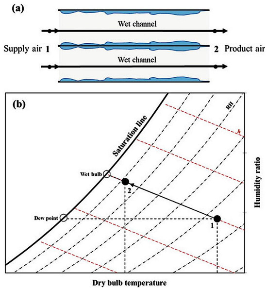 DEC represents the most straightforward form of EC technology, primarily focused on cooling supply air through direct contact with water, as illustrated in Figure 3a. It capitalizes on the vapor pressure difference between the water surface and the supply air, causing the supply air to cool along the isoenthalp line. This cooling process is facilitated by moisture absorption from the water source, as depicted in Figure 3b. In general, DEC can be classified into active and passive types. Active DEC relies on electricity to power the system and requires less power compared to conventional MVC systems. Active DEC has the potential to achieve energy savings of up to 90% under specific conditions [38]. Passive DEC, sharing a similar structural composition and operational principles with active DEC, relies on natural ventilation instead of auxiliary drive systems for its evaporation process. However, its effectiveness is significantly influenced by ambient environmental factors [39]. DEC achieves temperature reduction through the fundamental processes of heat and mass transfer between air and water. However, it is important to note that the accumulation of excessive humidity within enclosed spaces can be problematic. Prolonged exposure to overly humid conditions can lead to discomfort and potentially contribute to conditions associated with sick building syndrome.