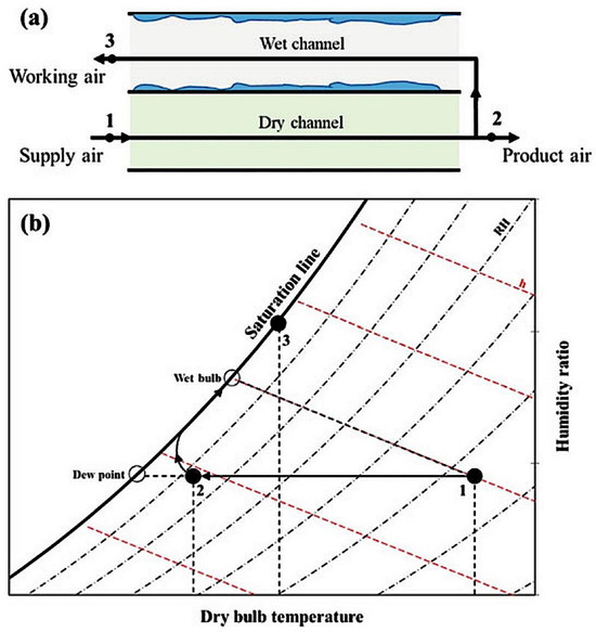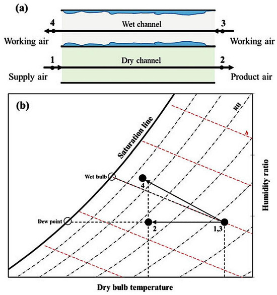 Working principle of counter-flow DPEC: (a) Schematic diagram and (b) Psychrometric chart [13].