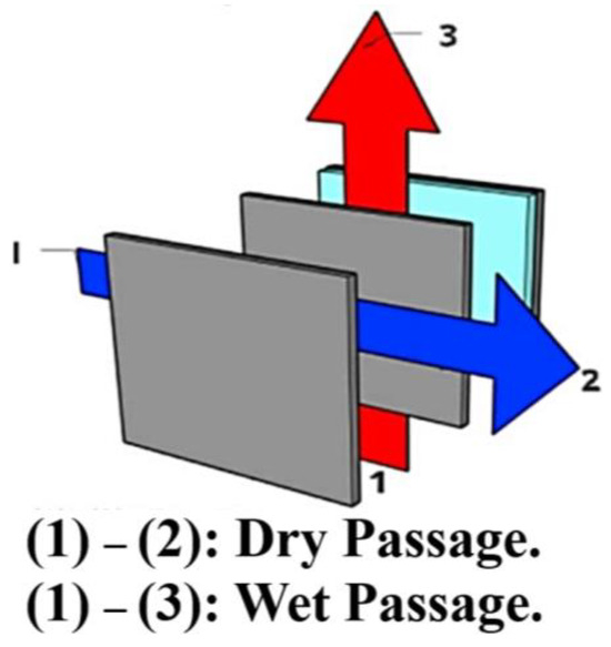 IEC provides a solution to address the challenge posed by increased humidity levels that often accompany the air produced by DEC [40]. The fundamental operational principle of IEC closely parallels that of DEC, involving the reduction of air temperature through the transfer of heat and mass between water and air. However, IEC introduces a crucial distinction: it partitions air channels into dry and wet sections using thin plates, as depicted in Figure 4a. The dry channel serves as the path for air cooling, while the wet channel serves as the working zone with its surface covered in water. These two channels do not exchange moisture, ensuring that the humidity of the produced air remains unchanged. The airflow in the wet channel triggers the evaporation of water from the surface, leading to the absorption of heat from the supply air in the adjacent dry channel. The psychrometric chart of the IEC process is illustrated in Figure 4b. During this process, the temperature of the supply air stream decreases as its enthalpy is transferred to the working air stream. The working air, having absorbed a substantial amount of enthalpy, becomes nearly saturated and is then released into the ambient environment. IEC is typically categorized into two configurations: counter-flow and cross-flow, based on the directions of air intake [41,42]. In counter-flow IEC, the supply and working air flows move in opposing directions, as depicted in Figure 4a. In contrast, cross-flow IEC features perpendicular alignment of the supply and working air streams in adjacent channels, as shown in Figure 5. While IEC effectively addresses the humidity issue, it is important to note that its cooling efficiency is subject to certain limitations [43].
