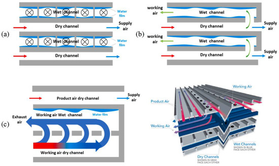 Schematic diagrams of the flow configuration of DPEC: (a) Cross-flow; (b) Counter-flow; and (c) Modified cross-flow [46].