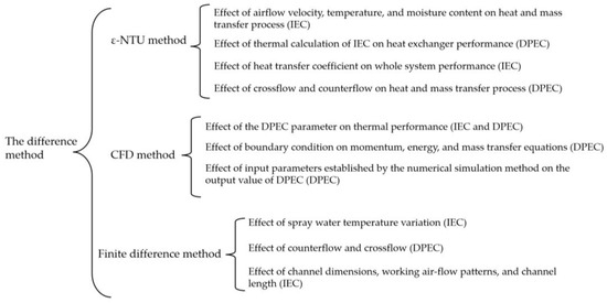 In fact, there is little difference in the relationship between IEC and DPEC concerning analytical solutions and numerical models. To explore a method for achieving sub-wet bulb temperatures using IEC, Hasan developed an analytical model based on the effectiveness-NTU method (ε-NTU). A modified analytical model can also be established based on the ε-NTU method for sensible heat exchangers, provided proper adjustments are made by redefining potential gradients, transfer coefficients, heat capacity rate parameters, and assuming a linear saturation temperature-enthalpy relation of air [17]. In the context of numerical simulations for DPEC, Pandelidis [71] investigated a mathematical model for heat and mass transfer, considering two different cyclic ways (counter-flow and cross-flow) in heat and mass exchangers. This model was also based on the ε-NTU method. These numerical simulation methods reveal unique characteristics of the considered units, enabling accurate predictions of their performance and facilitating comparisons between the two types of heat exchangers in various AC applications to achieve optimal efficiency. Pakari and Ghani [72] proposed regression models that establish relationships between input parameters, including operational and geometrical factors, and selected output responses of counter-flow DPEC systems using numerical simulations and response surface methodology. The predicted outlet temperatures of the system, based on the regression model, closely match the predictions from the numerical model and experimental measurements, within margins of ±4% and ±10%, respectively. Moreover, the novel DPEC technology has garnered significant attention. Cui [73] validated the performance using a computational model through CFD methods for the cooler. The model demonstrated close agreement with experimental findings, with discrepancies within ±7.5%. In addition to the information provided, numerous theoretical and numerical studies on the heat and mass transfer processes of IEC and DPEC have been documented, as summarized in Table 2. Moreover, to illustrate the shared characteristics and distinctions between the IEC and DPEC models, Figure 8 serves as a valuable reference.
