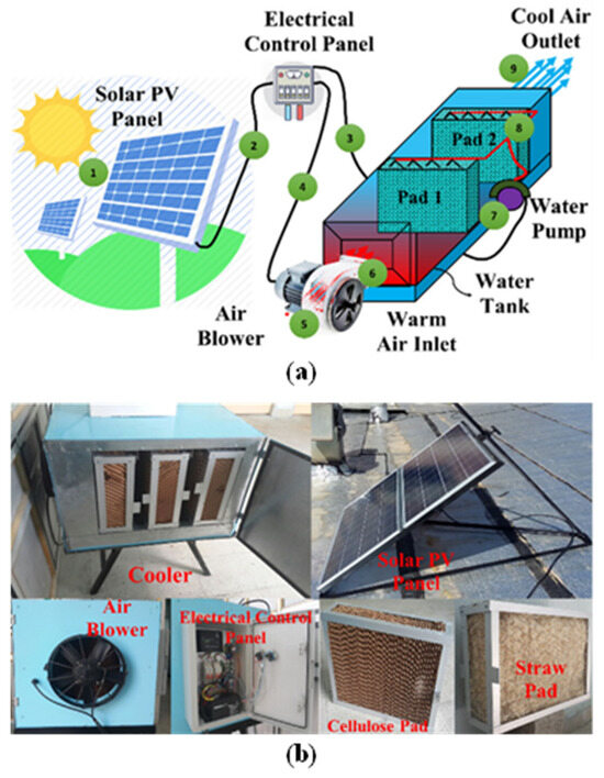 Experimental setup: (a) schematic diagram of DEC system coupled with SPV panel and (b) different parts of the tested system [102].