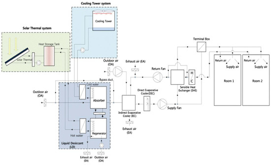 - Ghosh, A.; Bhattacharya, J. A solar regenerated liquid desiccant evaporative cooling system for office building application in hot and humid climate. Therm. Sci. Eng. Prog. 2021, 22, 100804. [Google Scholar] [CrossRef]