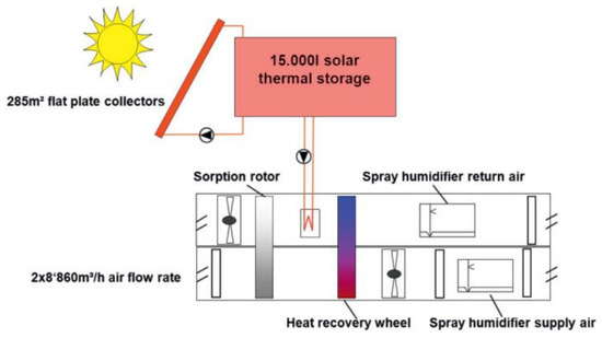 As a simple and direct heating method, SE can enhance the cooling efficiency without affecting the system’s operation. Preisler and Brychta [111] highlighted the use of SE in DEC and energy storage through solar thermal means. The solar-driven DEC systems incorporate a sorption rotor, spray humidifier, and solar thermal storage. The cooling method involves active DEC, as illustrated in Figure 14. Solar thermal energy is used to heat the sorption rotor and the heat recovery wheel for reusability. The results indicated that the system could save 50% of primary energy at an ambient temperature of 24 °C and 60% relative humidity. However, the sorption rotor spends most of its time on heating and humidity recovery and less time on the desiccant rotor for dehumidification.