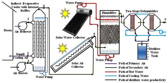 Kabeel et al. [112] introduced an innovative hybrid system that combines IEC and humidification–dehumidification (HDH) desalination, as depicted in Figure 15. The primary objective of this system was to optimize the utilization of waste heat generated by the IEC system with the assistance of solar collectors to power the HDH desalination process. This integration of SE and EC helped save overall system space. The part of the hybrid system used counter-flow IEC. Research findings revealed that the cooling load rate varied between 253.26 and 417.4 W for a 70 m3/h air flow rate during 8.00 a.m. to 6.00 p.m. The COP of this system ranged between 0.214 and 3.49 at a 70 m3/h air flow rate.