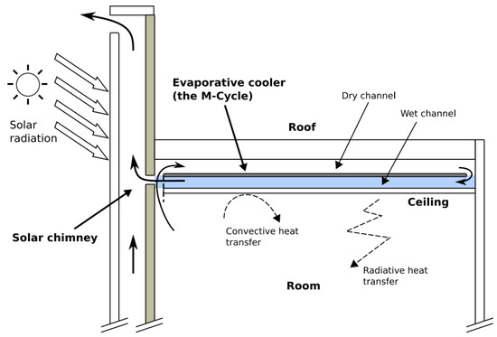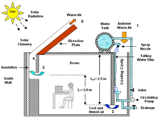 Maerefat and Haghighi [113] introduced the innovative concept of integrating SE and EC to create more comfortable thermal conditions within living spaces. Their system combined a solar chimney (SC) with a cooling cavity, as illustrated in Figure 16. This setup included an SC, a water storage tank, and an EC cavity. The cooling cavity utilized passive DEC, with careful attention to ventilation and cavity length to enhance its effectiveness. The study revealed that with a heat flux density of 200 W/m2 in the SC, outdoor air temperature and relative humidity set at 34 °C and 30%, respectively, indoor temperature and relative humidity could reach 25.49 °C and 86.65%, creating a more comfortable indoor environment. In a similar vein, Miyazaki et al. [114] proposed a passive refrigeration unit designed to reduce the cooling load of AC in hot and humid climates. This passive system, depicted in Figure 17, incorporated an SC heated by solar radiation to induce upward airflow. The cooling air of the system was generated by the DPEC process. The results demonstrated that the room temperature could effectively be maintained around 25 °C, successfully managing a cooling load of 40–50 W/m2 without raising the ceiling temperature. Implementing this system had the potential to further reduce the cooling load by approximately 10%. For a comprehensive overview of the studies mentioned above, Table 3 summarizes the key features and roles of EC within hybrid EC and SE systems.